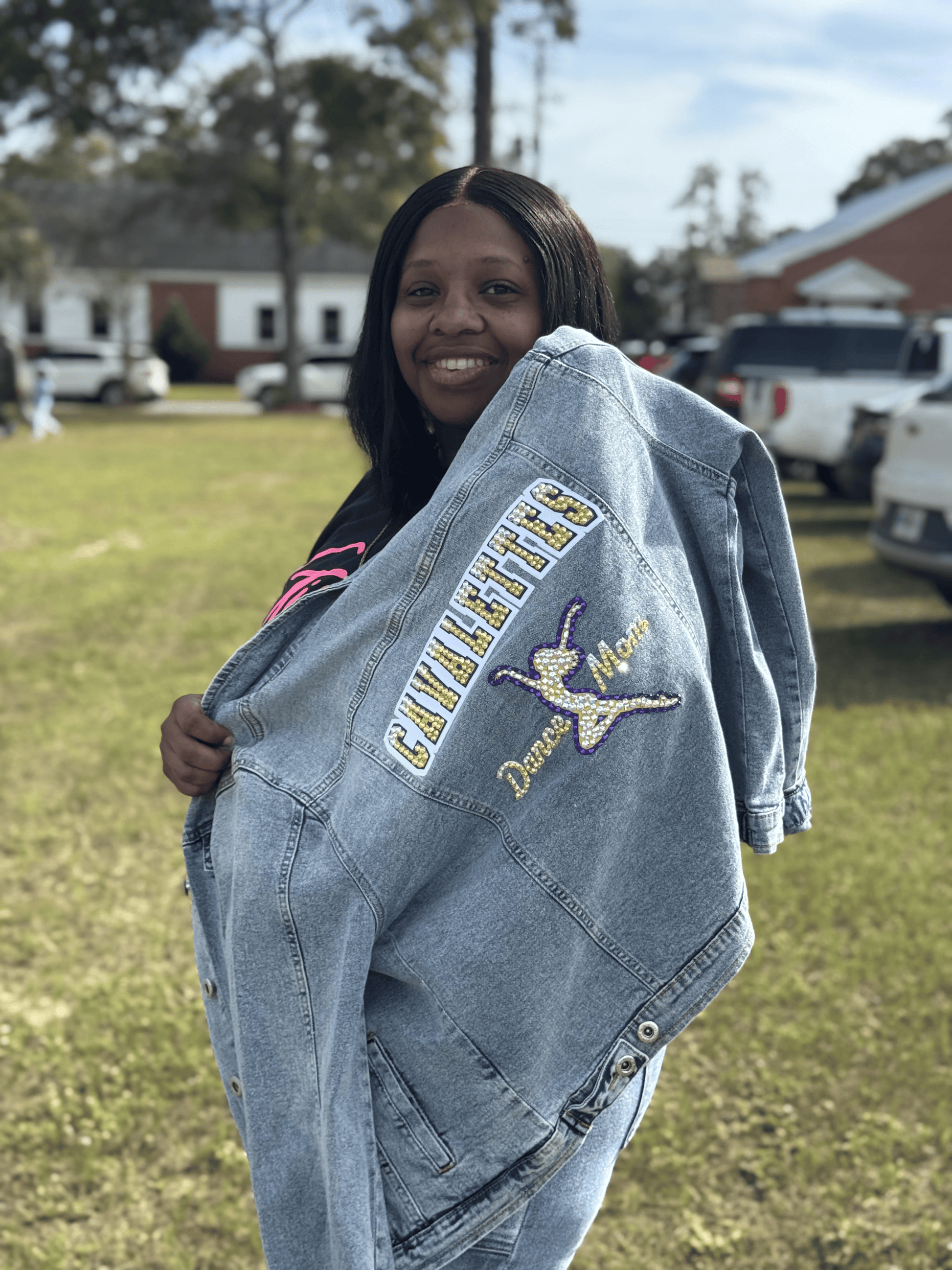 Show off your style with this custom blinged denim jacket made just for moms, alumni, and coaches.